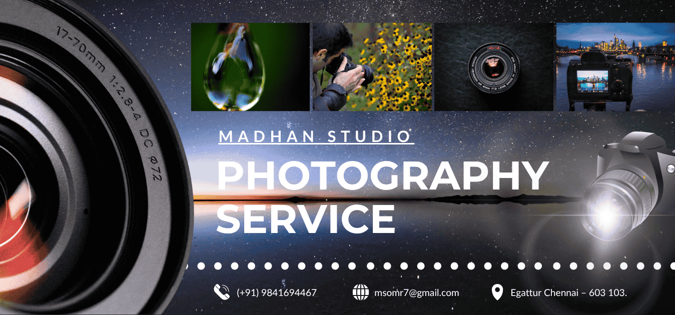 Whether it's a family portrait, wedding, corporate event, or personal portfolio, our talented team of photographers is passionate about creating stunning images tailored to your unique story. At Madhan Studio, we believe that every picture has a story to tell. Using the latest equipment and creative techniques, we aim to deliver images that are not only beautiful but also meaningful. Customer satisfaction is at the heart of everything we do. Let us help you capture memories that last a lifetime.